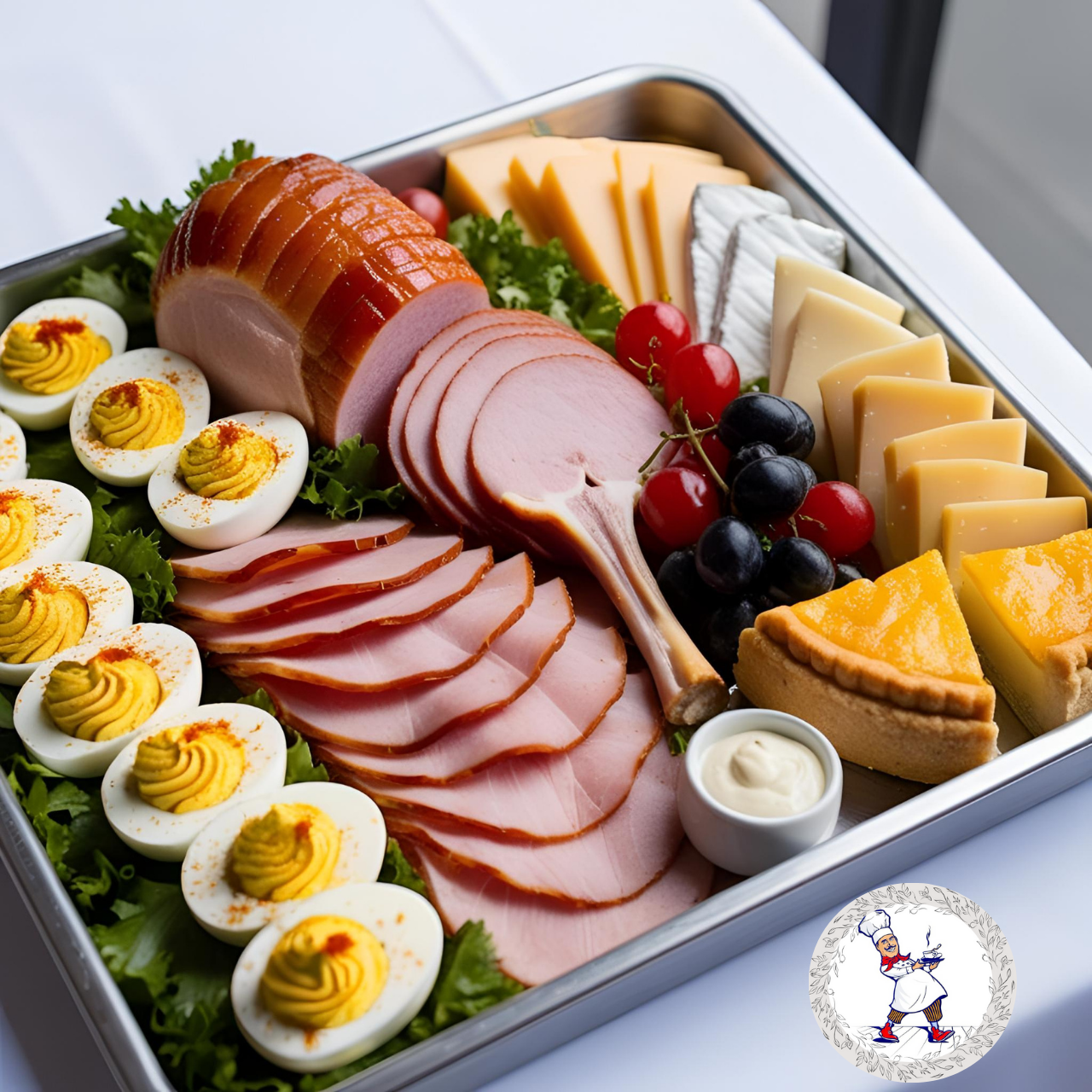 Ce plateau débute par une sélection de cinq entrées froides, telles que des œufs à la russe, une salade niçoise ou piémontaise, et une terrine de légumes. En plat principal, choisissez parmi des options froides comme la trilogie du boucher (bœuf, porc, volaille) ou un jambon à l’os savoureux. Un assortiment de cinq fromages, incluant du Pont-l’Évêque et du Livarot, est également proposé.